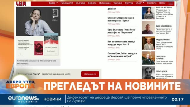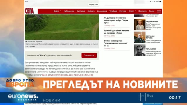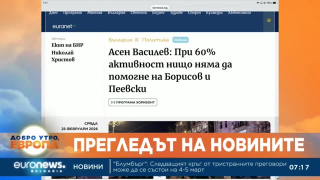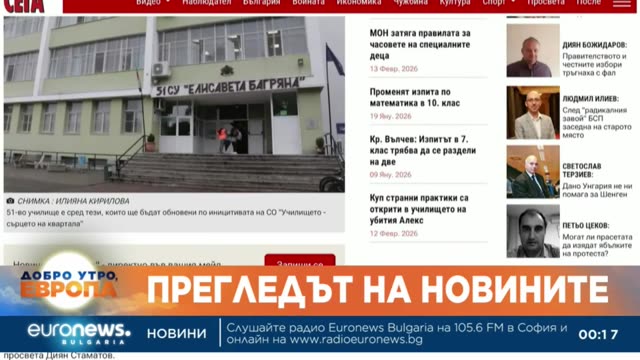 Денят започва с "Добро утро, Европа". Сутрешният блок на Euronews Bulgaria представя важното от България, Европа и света. Анализ на събитията, които имат значение, актуални гости, задълбочени коментари, култура. Различните гледни точки. Нашите журналисти са в центъра на най-важните събития, за да отведат зрителите там, където се случват новините.